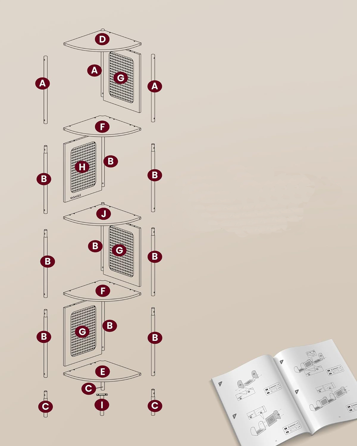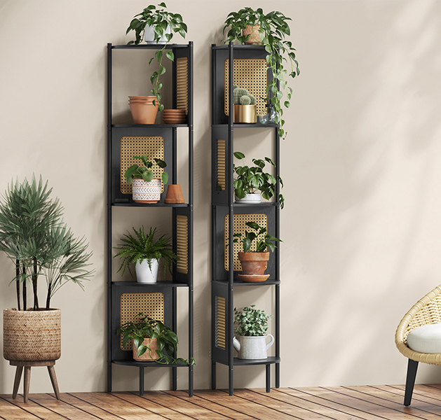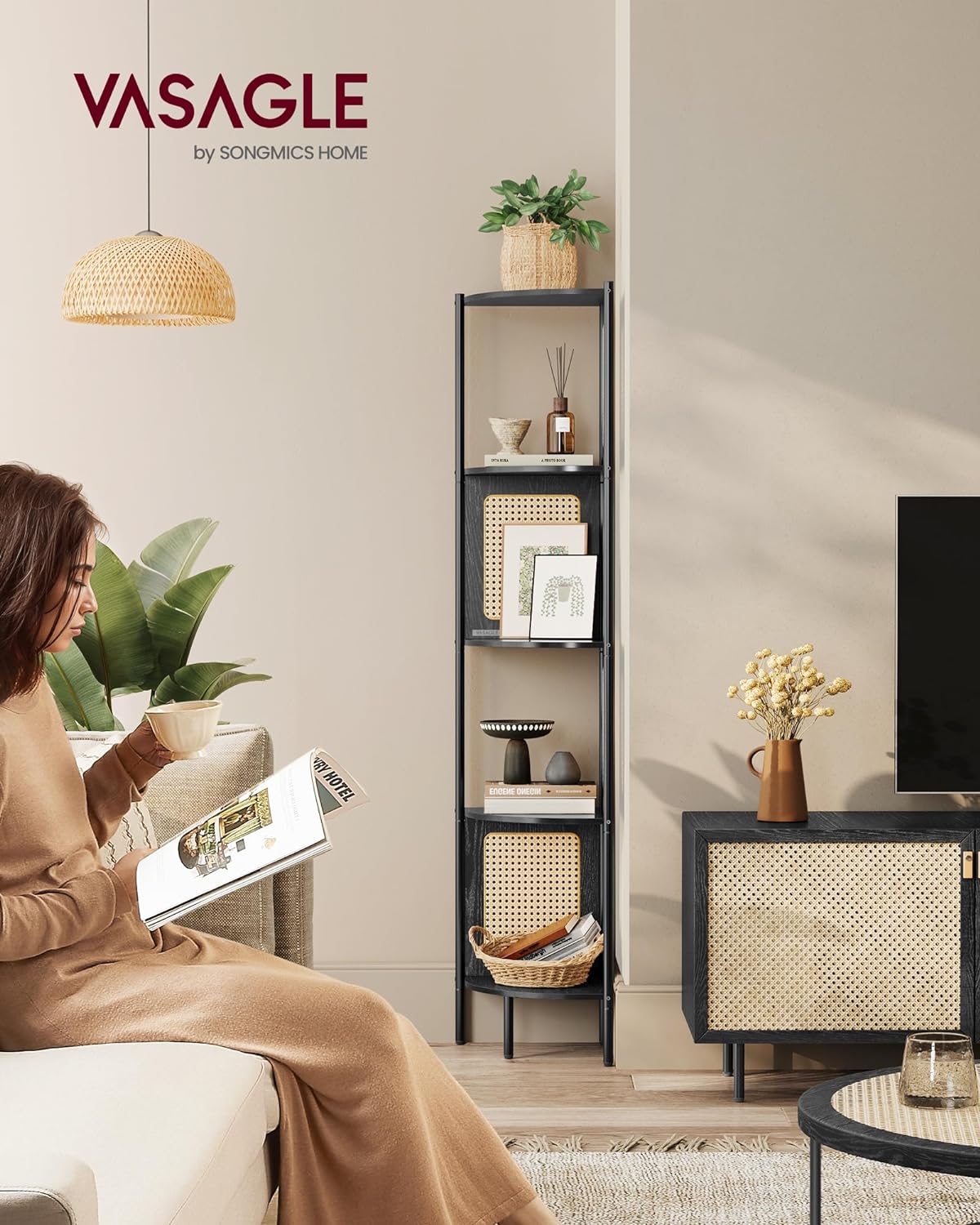 VASAGLE Raft de colt boho, cadru metalic, polite MDF si panouri poliratan, 32x32x156cm, negru Household NewTrend