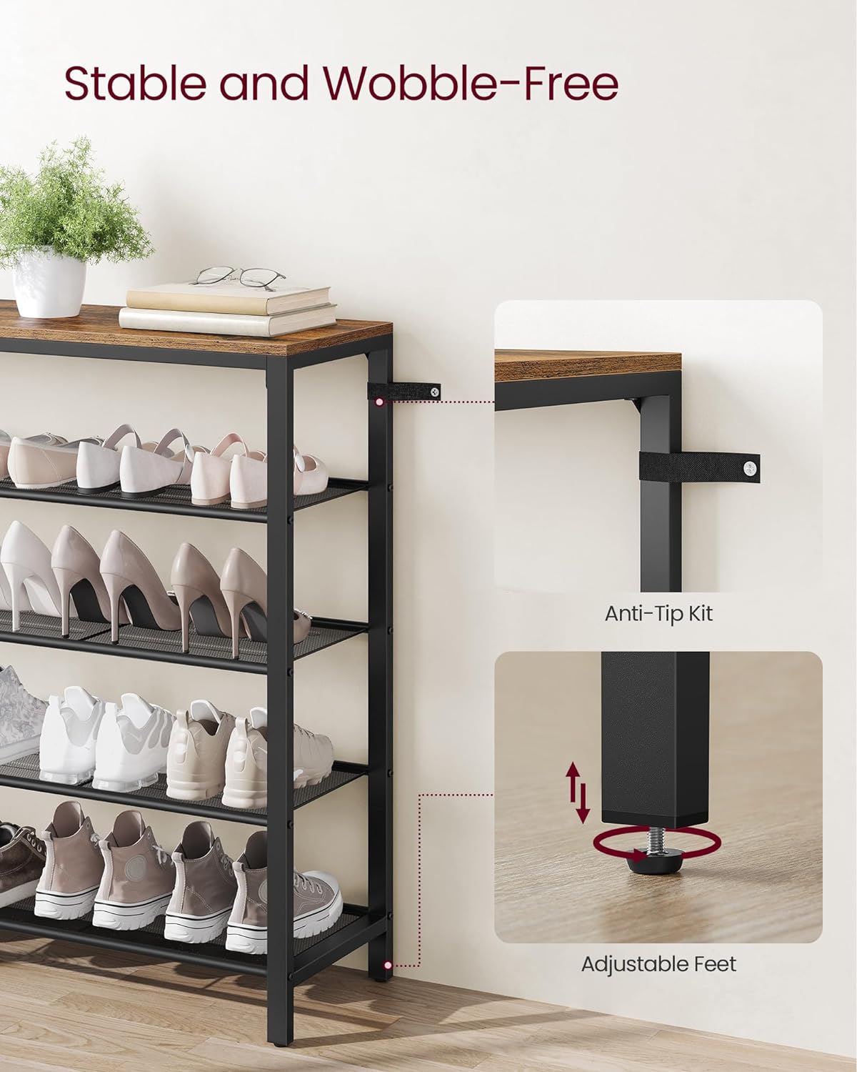 VASAGLE Raft de pantofi, cu 4 rafturi din plasa, cadru din otel, industrial, 30x100x92cm, maro rustic si negru Household NewTrend