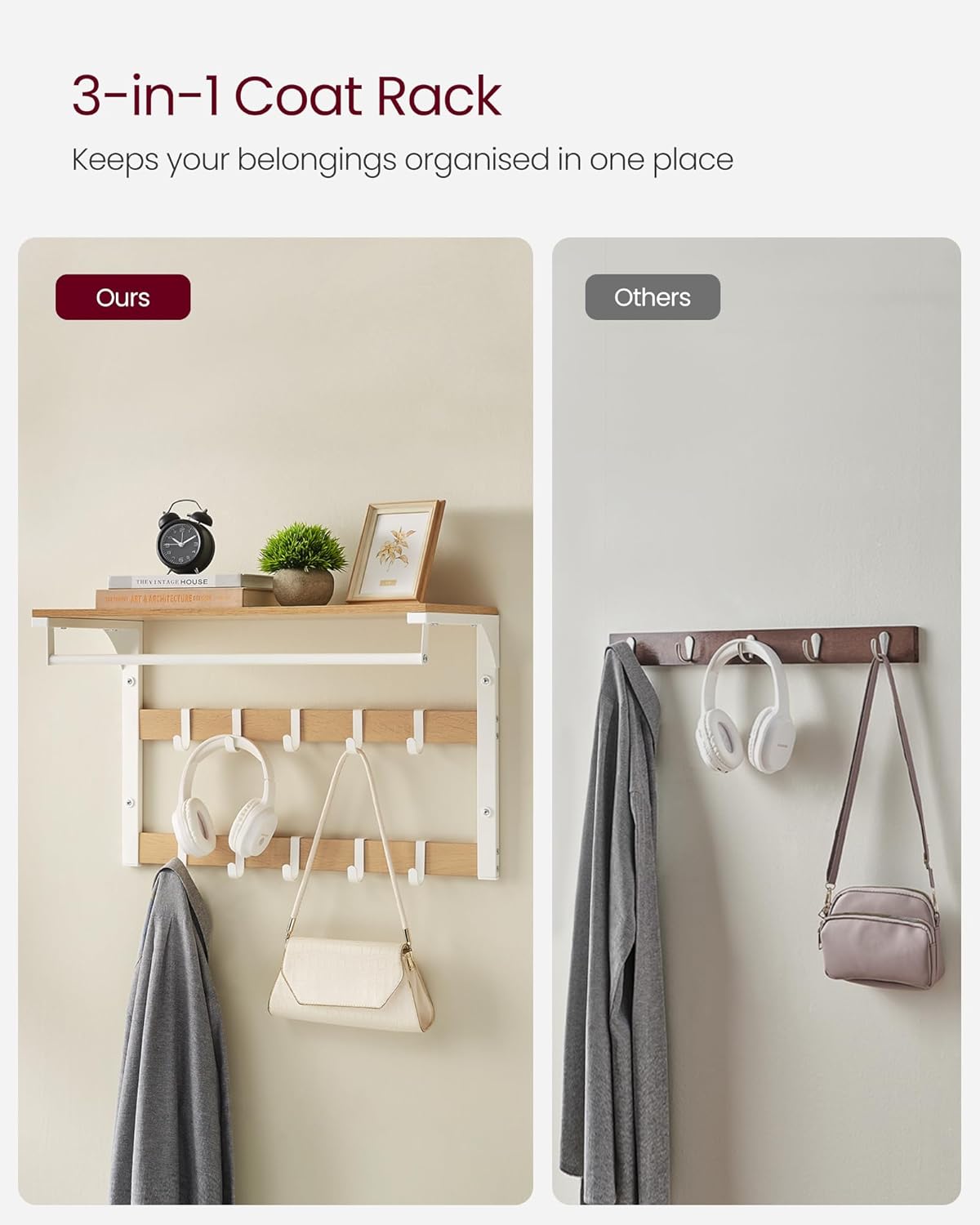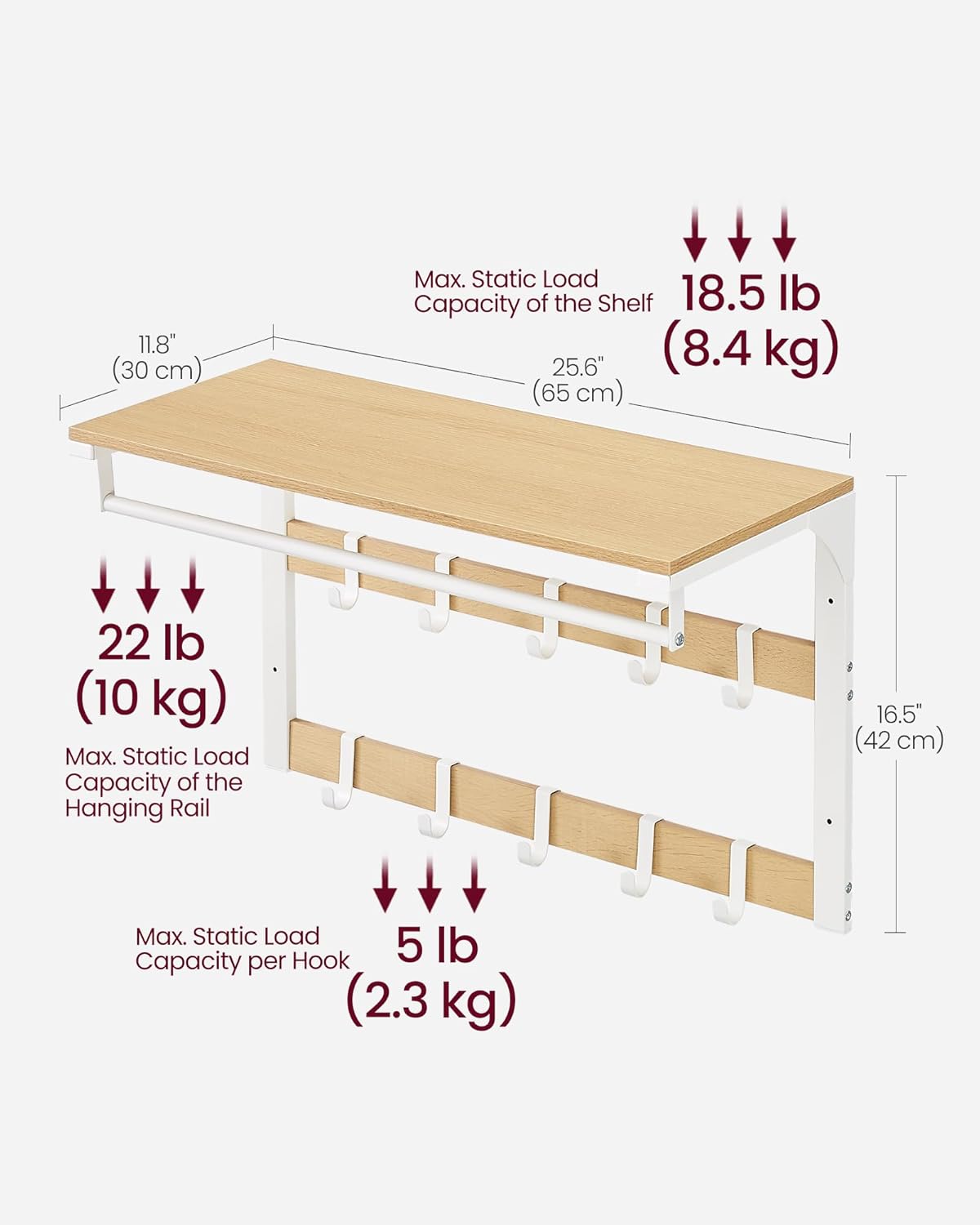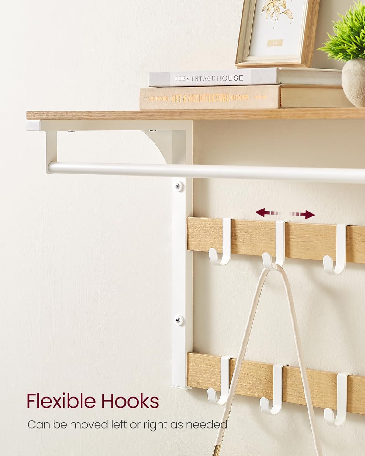 VASAGLE Raft de perete tip cuier, 10 carlige detasabile, sina pentru haine, 30x65x42cm, stejar si alb Household NewTrend