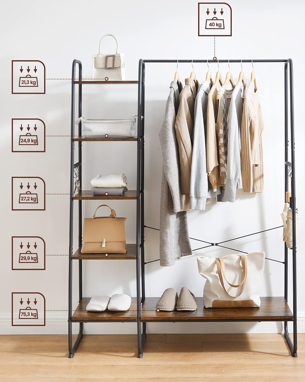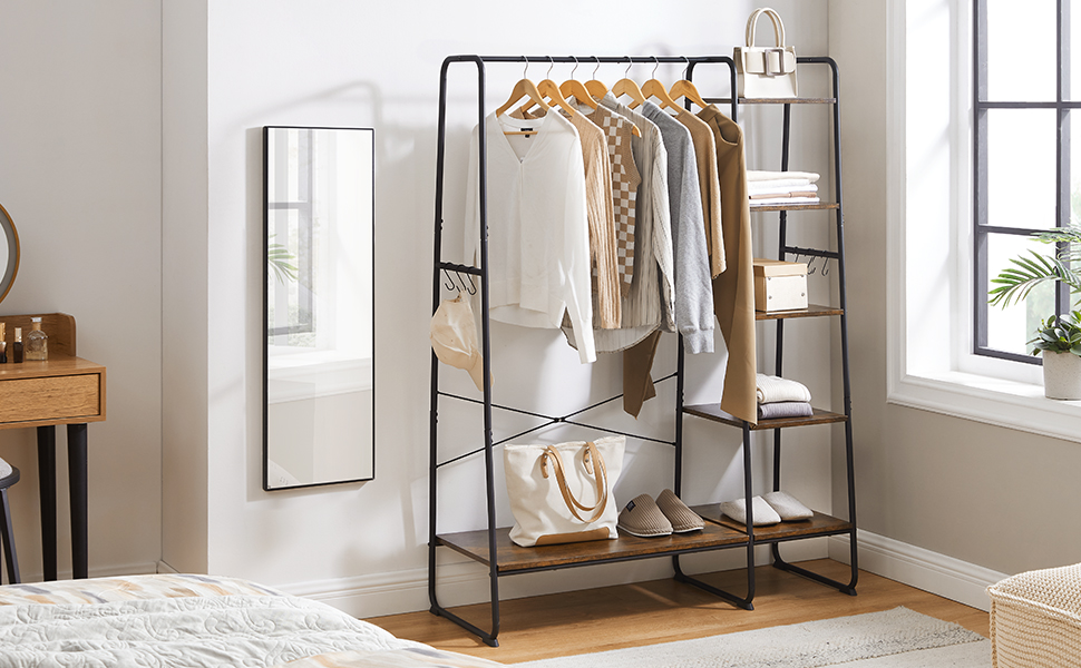 VASAGLE Raft pentru haine cu suport pentru pantofi, 5 polite, 6 carlige laterale, 45x120x160cm, maro rustic si negru Household NewTrend