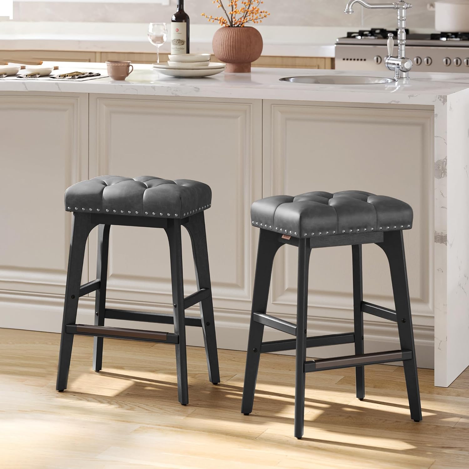 VASAGLE Set 2 scaune bar cu tapiterie piele ecologica, picioare din lemn, 44x32x66 cm, negru Household NewTrend