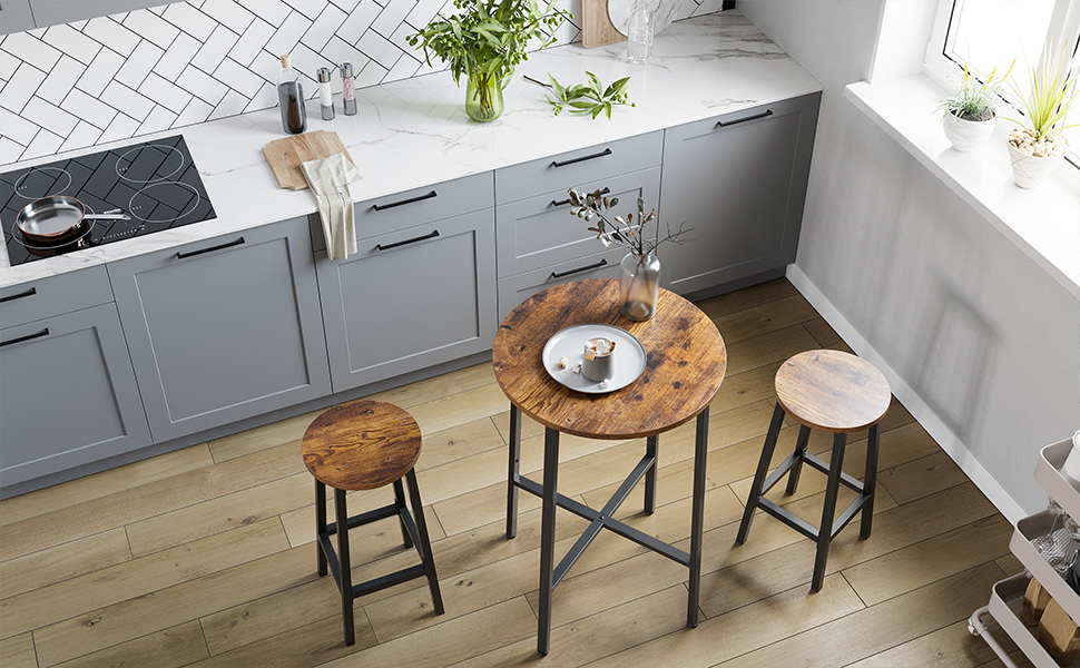 VASAGLE Set 2 scaune bar inalte, sezut rotund, cadru din otel, inaltime 65 cm, stil industrial, maro rustic si negru Household NewTrend