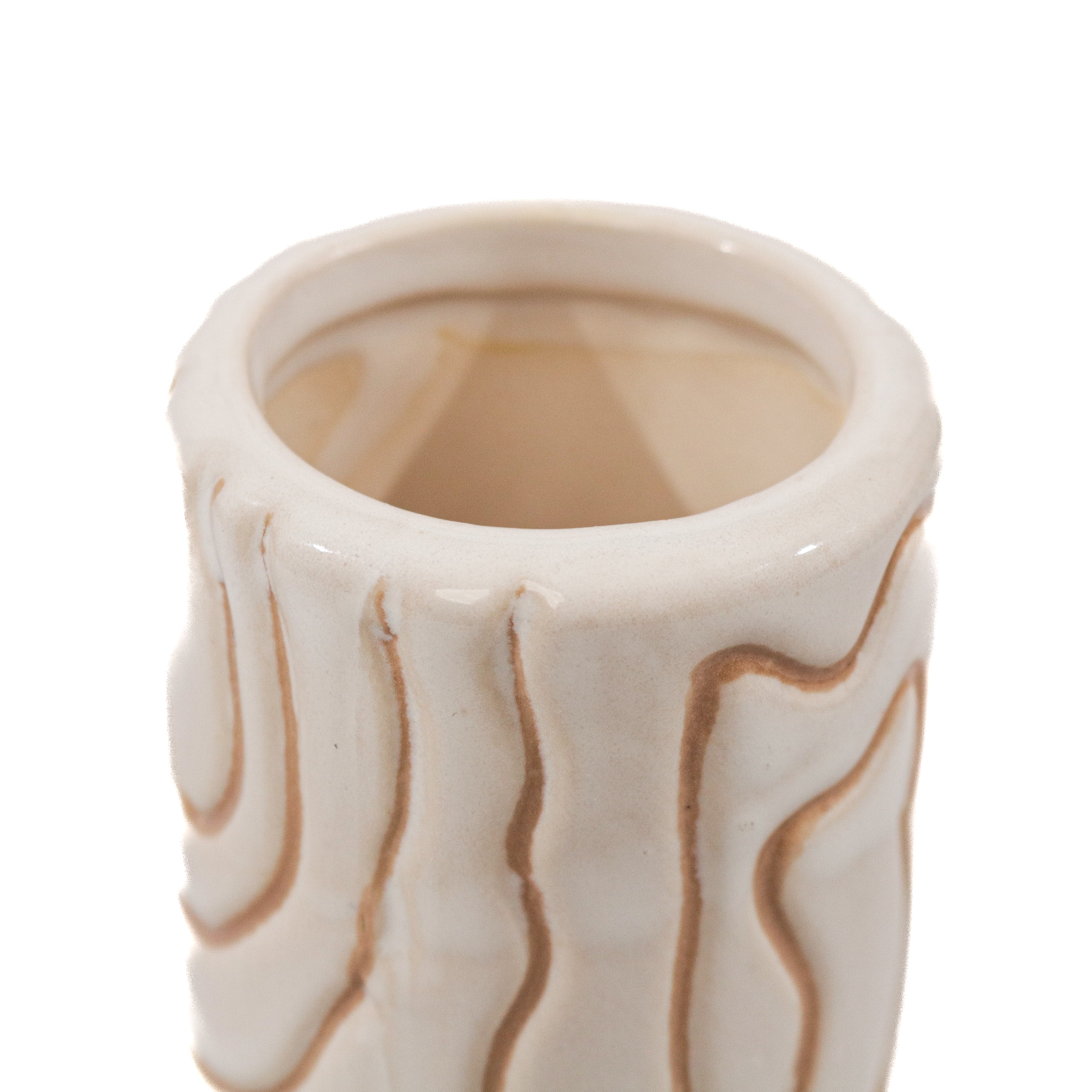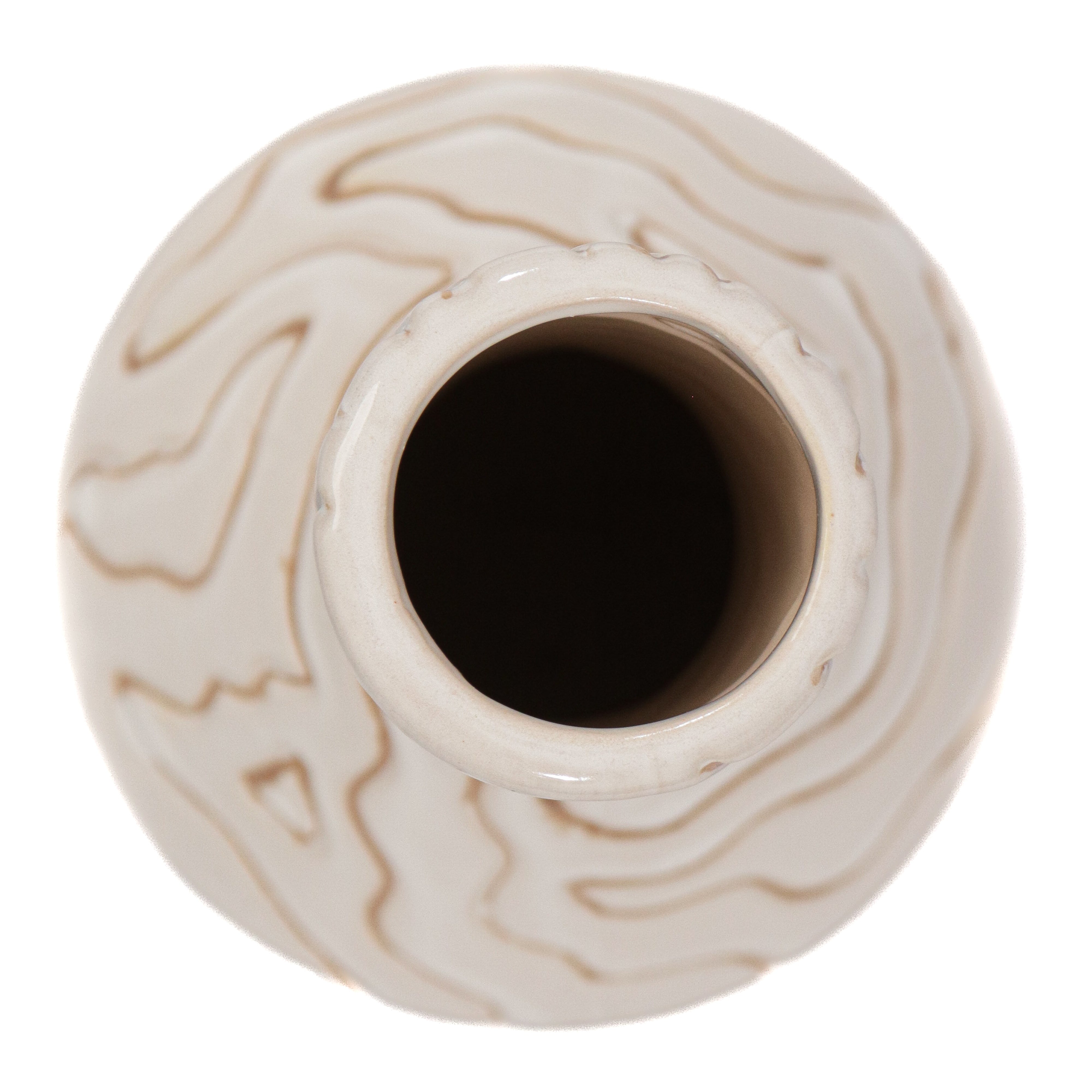 Aceasta vaza din ceramica, cu o înalțime de 21 cm, se remarca prin designul sau unic și modern. Vaza are o forma eleganta, cu un gât îngust și o baza mai larga, fiind decorata cu un model abstract de linii ondulate în relief, care adauga textura și un aspect artistic. Culoarea sa predominanta este alb-crem, iar liniile sunt de un maro subtil, creând un contrast placut și sofisticat. Aceasta piesa este ideala pentru a adauga un element de stil și rafinament oricarui spațiu interior, fie ca este vorba de o locuința moderna sau de un birou elegant.
