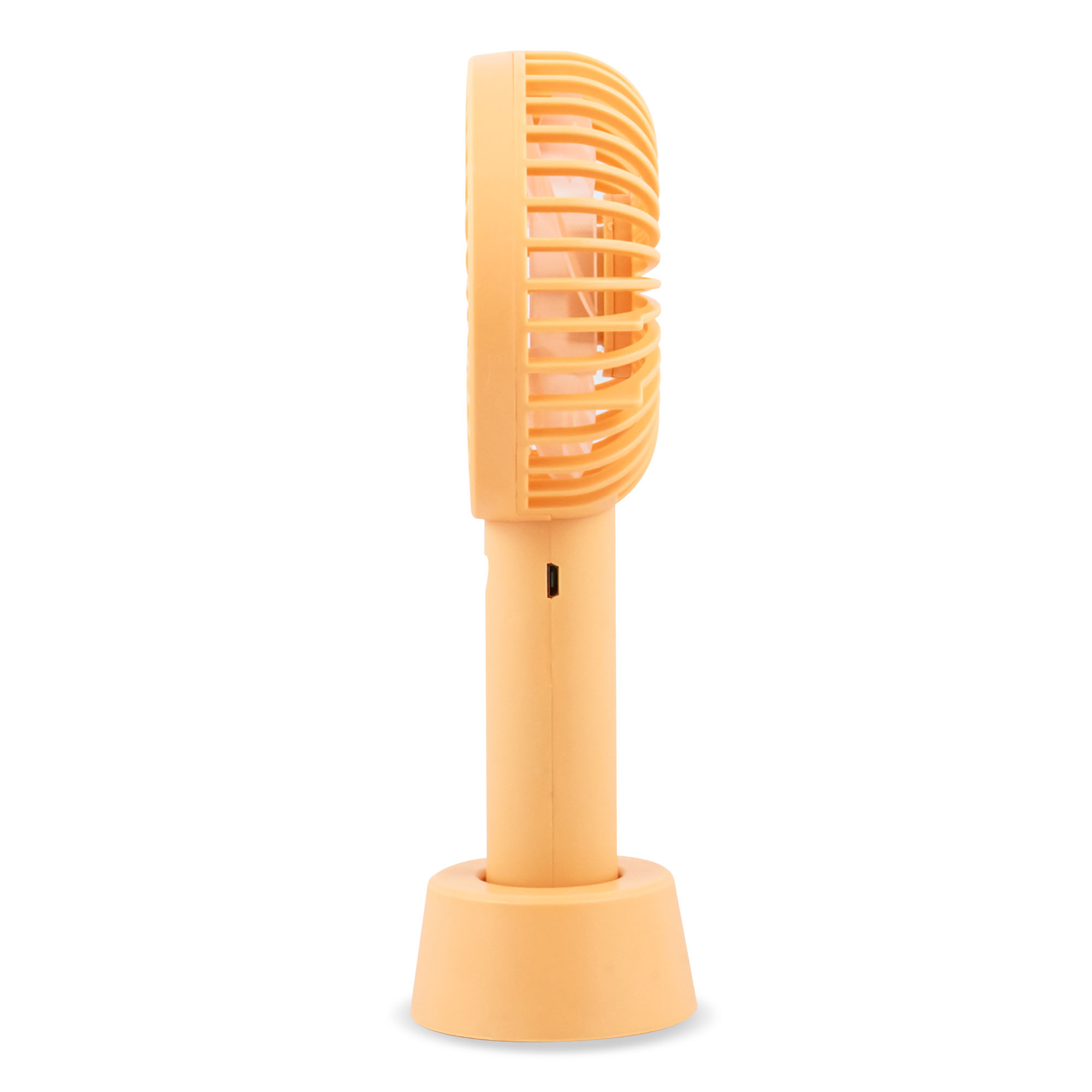 Mod de utilizare: incarca ventilatorul prin cablul USB inclus, apasa butonul de pornire si selecteaza viteza dorita. Pentru confort sporit, il poti folosi direct in mana sau il poti aseza pe birou in suportul dedicat.