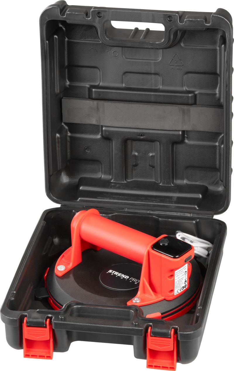 Ventuză cu acumulator Strend Pro Premium pentru prindere, ridicare și transport în siguranță al suprafețelor netede. Este ideală pentru sticlă, gresie/faianță, piatră lustruită sau tablă metalică, fiind un ajutor de încredere la montaj, placări și lucrări de tâmplărie/atelier.