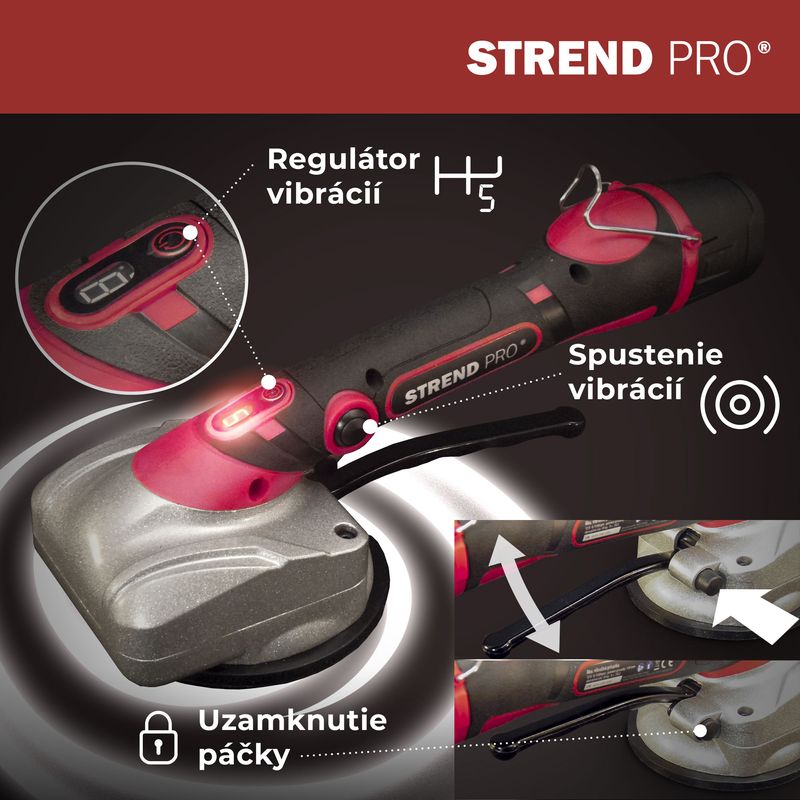 Ușurează montajul plăcilor cu această ventuză vibratoare pentru gresie și faianță Strend Pro – o alternativă modernă la manipularea manuală. Vibrațiile ajută la eliminarea bulelor de aer din adeziv, pentru o aderență mai bună și o poziționare mai precisă.