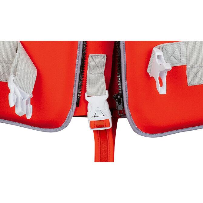 Vesta este confectionata dintr-o invelitoare rosie din neopren confortabil de inalta calitate, recunoscut pentru senzatia placuta si durabilitate. Elementele de flotabilitate solide integrate asigura un grad ridicat de plutire in apa astfel incat copilul dumneavoastra este tinut in siguranta pe linia de plutire in timp ce exploreaza lumea inotului. Cocodilul simpatic imprimat se anunta a fi prietenul de nadejde al micului inotator.