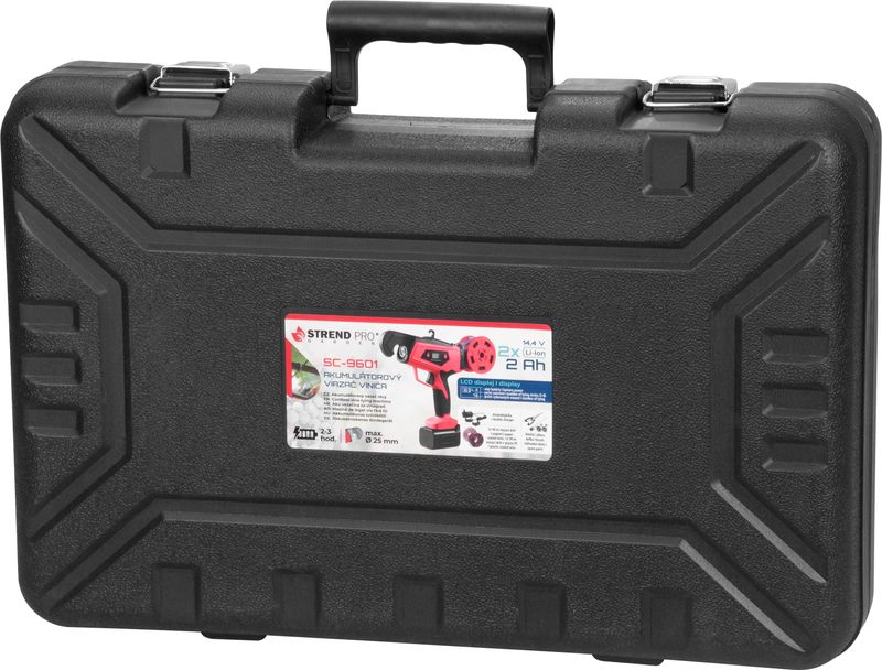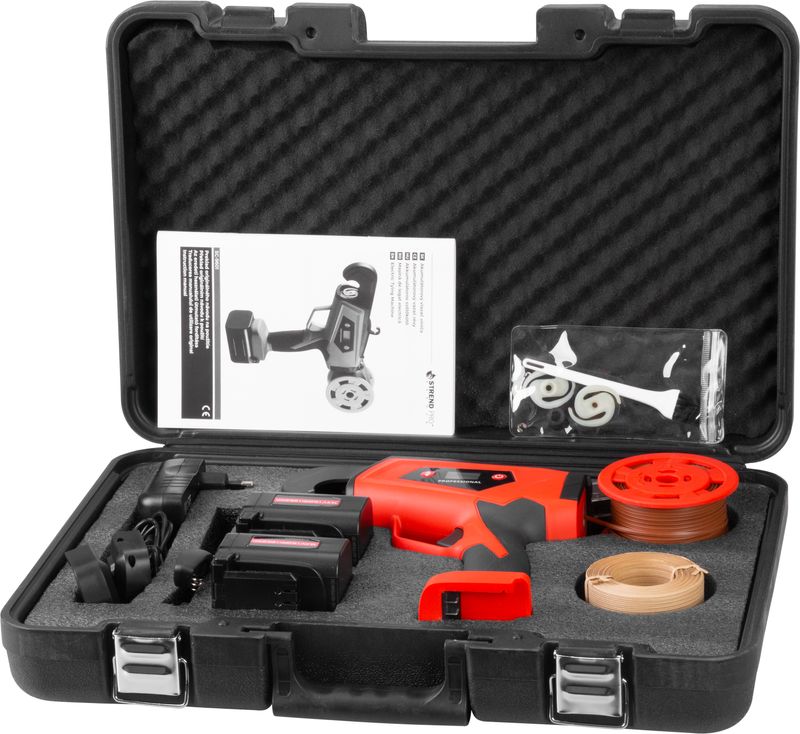 Akumulátorový viazač viniča Strend Pro Profesional s LCD displejom sa používa najmä na viazanie výhonkov viniča (eventuálne ostatných rastlín) s priemerom maximálne do 25 mm. Výrazne uľahčuje prácu vo vinosadoch, práca je nielen jednoduchá, ale uviazaný spoj je aj oveľa kvalitnejší ako pri ručnom viazaní. Na jedno nabitie umožňuje až 8000 uviazaní. Balenie obsahuje: 1x viazač, 2x akumulátor 2.0 Ah, 1x dvojnabíjačku, 1x viazací drôt v papieri, 1x viazací drôt v plaste, kliešte, kefku a náhradné diely.