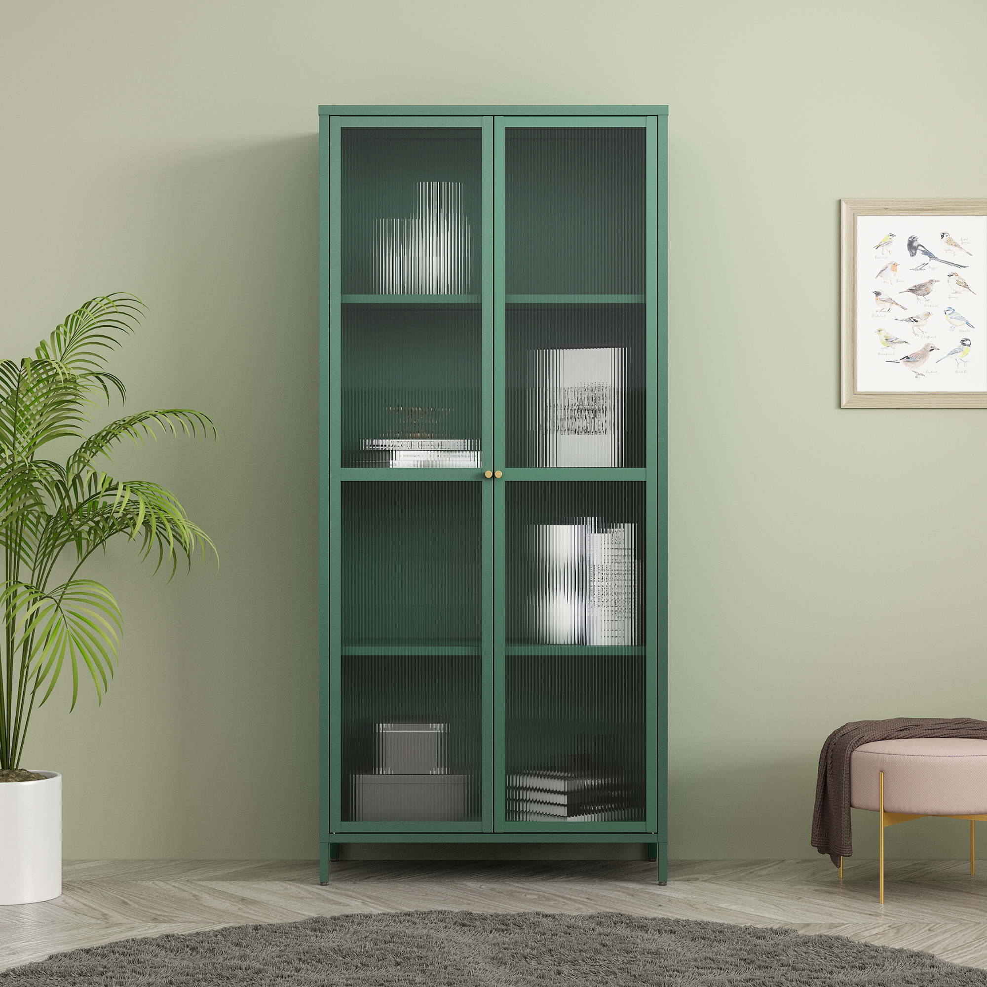 Descriere Vitrină living metal verde sticlă striată,