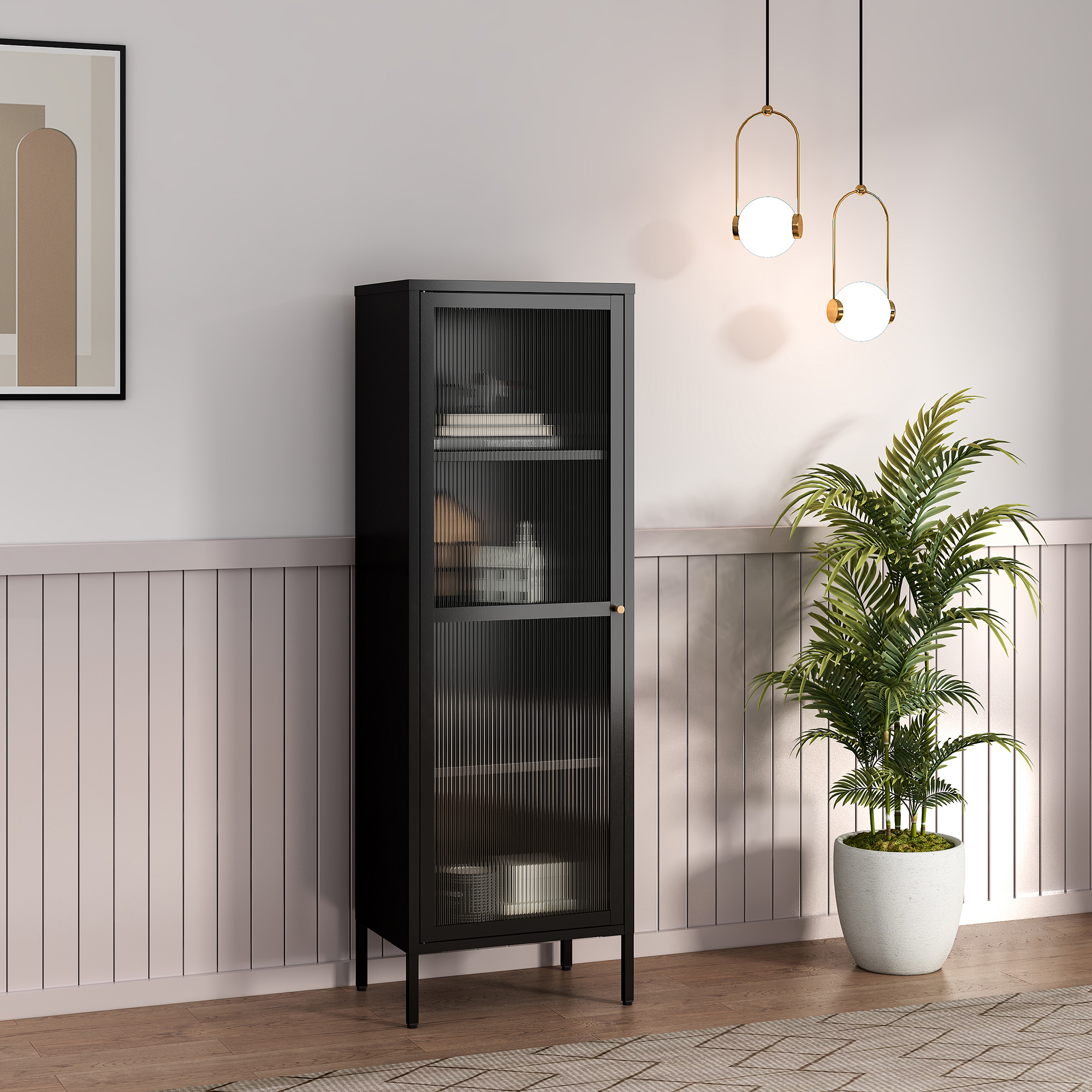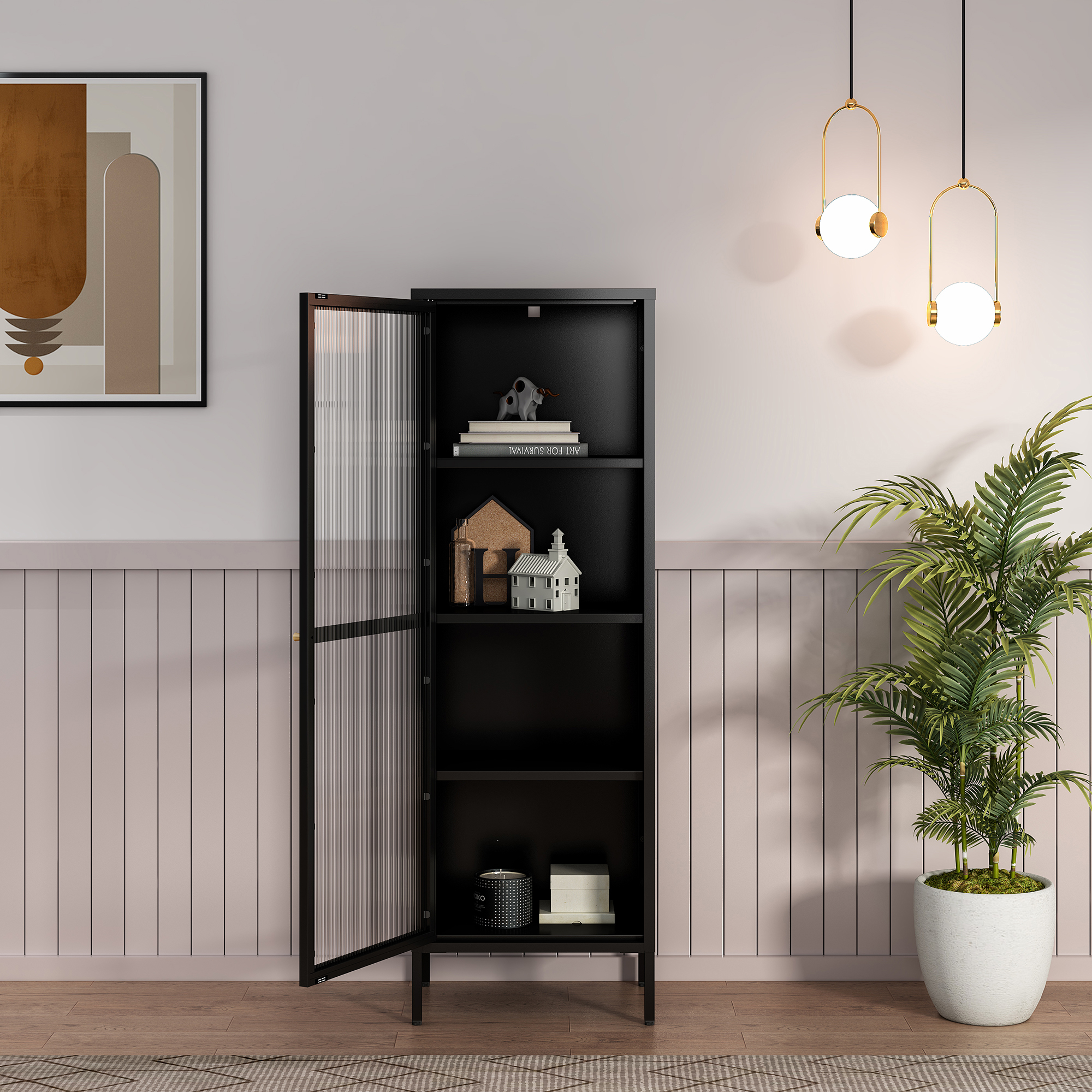 Vitrină living din oțel – o piesă de mobilier modernă și practică, ideală pentru organizarea elegantă a obiectelor din casă. Designul său minimalist, în finisaj negru, este completat de o ușă cu sticlă striată, care oferă un aspect rafinat și discret în același timp.