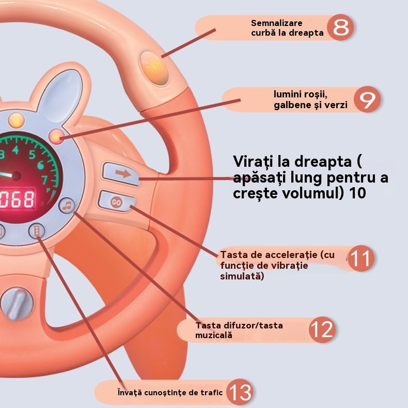 Acest volan interactiv pentru copii este o jucarie educativa si distractiva, care ii ajuta pe cei mici sa isi dezvolte cunostintele despre trafic si sa isi dezvolte coordonarea. Proiectat cu multiple functii atractive si dotat cu iluminare colorata, muzica si elemente interactive, volanul ofera o experienta realista si captivanta. Este ideal pentru copiii pasionati de masini si explorare, contribuind in acelasi timp la dezvoltarea abilitatilor motorii si cognitive.