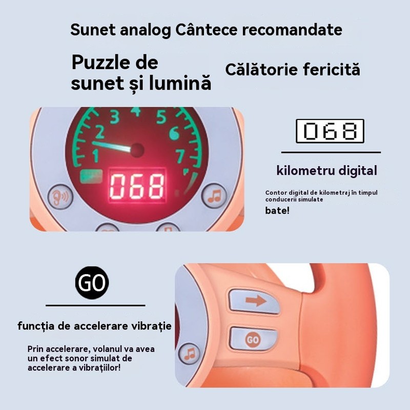 Ecranul digital simuleaza un kilometraj, oferindu-le copiilor senzatia de a conduce, ajutandu-i sa inteleaga notiuni elementare despre viteza si distanta. Pe langa aceasta functie, volanul dispune si de alte functii, cum ar fi: functia muzicala, care include diverse sunete si melodii, stimuland simturile auditive ale copiilor si facand joaca mai interactiva, functia de semnalizare stanga-dreapta, care ii ajuta pe cei mici sa invete notiunile de baza despre directie si reguli de trafic, facand jocul mai educativ si realist.