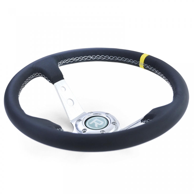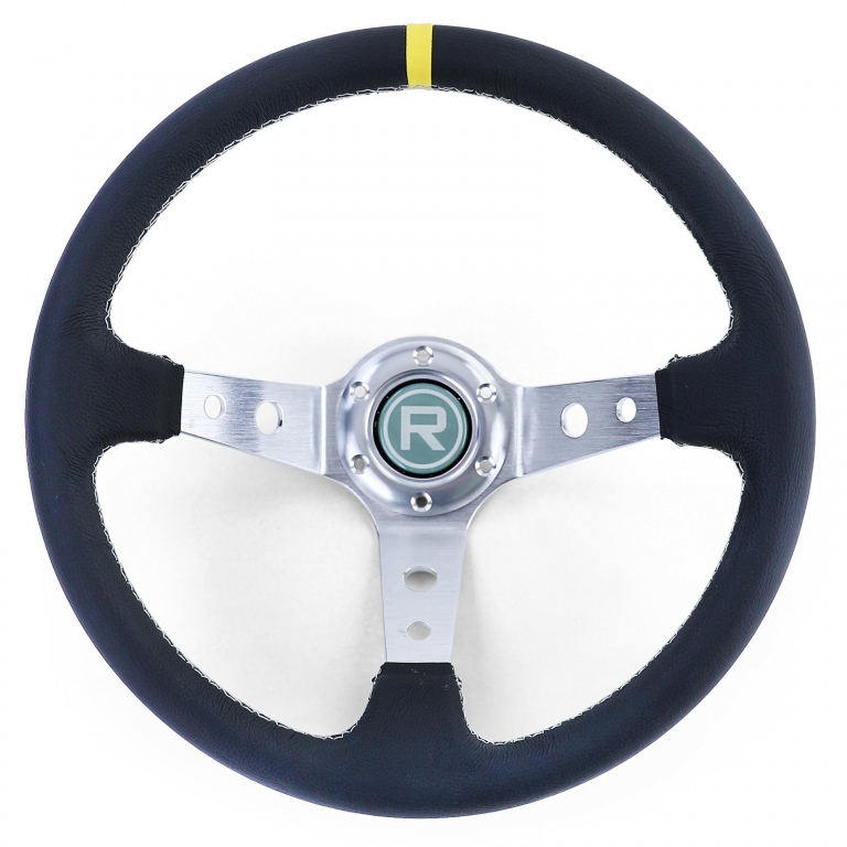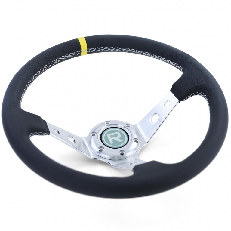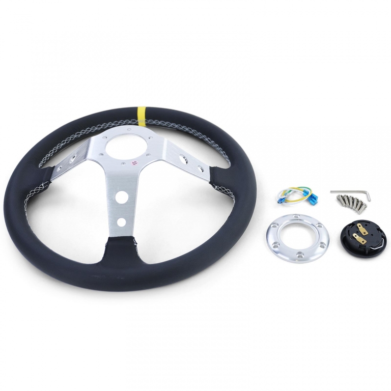 Volan de curse de înaltă calitate Tip 1, fabricat din piele autentică, cu un marcaj galben la 12 ore pentru un control maxim și un aspect sportiv. Foarte robust, cu formă ergonomic și extra aderent. ✅ Caracteristici ale produsului- Piele autentică cu marcaj galben la 12 ore- Foarte robust, execuție de înaltă calitate- Formă ergonomică pentru cea mai bună prindere- Potrivit pentru multe hub-uri (de exemplu, Momo, Sparco, Supersport)- Culoare: Argintie/Neagră- Nou & ambalat original ✅ Date tehniceDiametru: 350 mmAdâncime totală (în formă de bol): 96 mmCercul de prindere: 6 × 75 mmDistanța între găuri centru/centru: 35 mm ✅ Conținutul livrăriiVolan, buton de claxon, șuruburi de montare, cablu Notă: Doar pentru utilizare în curse. Fără ABE/certificare, nu este aprobat pentru utilizare pe drumurile publice.Informații de siguranță ale produsuluiProducător: Carparts-Online GmbHBrauckstr. 47, 58454 WittenContact: info@carparts-online.deInstrucțiuni de siguranță:Instrucțiuni de siguranță pentru ambalare:Există un risc de accidentare din cauza marginilor ascuțite de hârtie, carton sau folie, precum și a agrafelor metalice ascuțite.Materialul de ambalare nu este o jucărie. Risc de sufocare pentru copii sau animale.Instrucțiuni de siguranță pentru produs:Articolul trebuie utilizat doar pentru funcția sa descrisă inițial. Dacă aveți întrebări, vă rugăm să ne contactați prin metodele de contact menționate mai sus