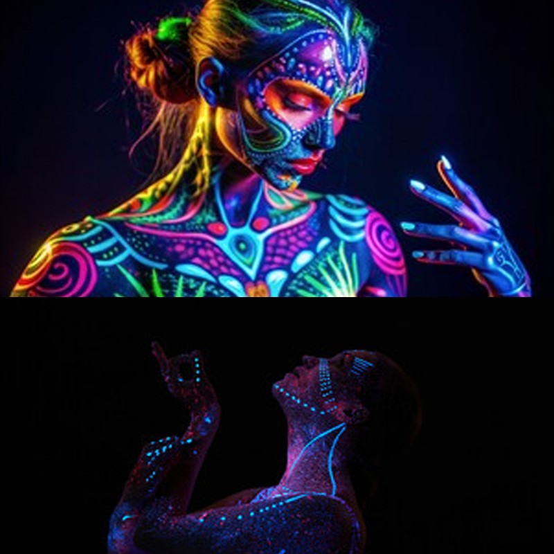 - Efect glow puternic sub lumină UV pentru machiaj și pictură pe corp