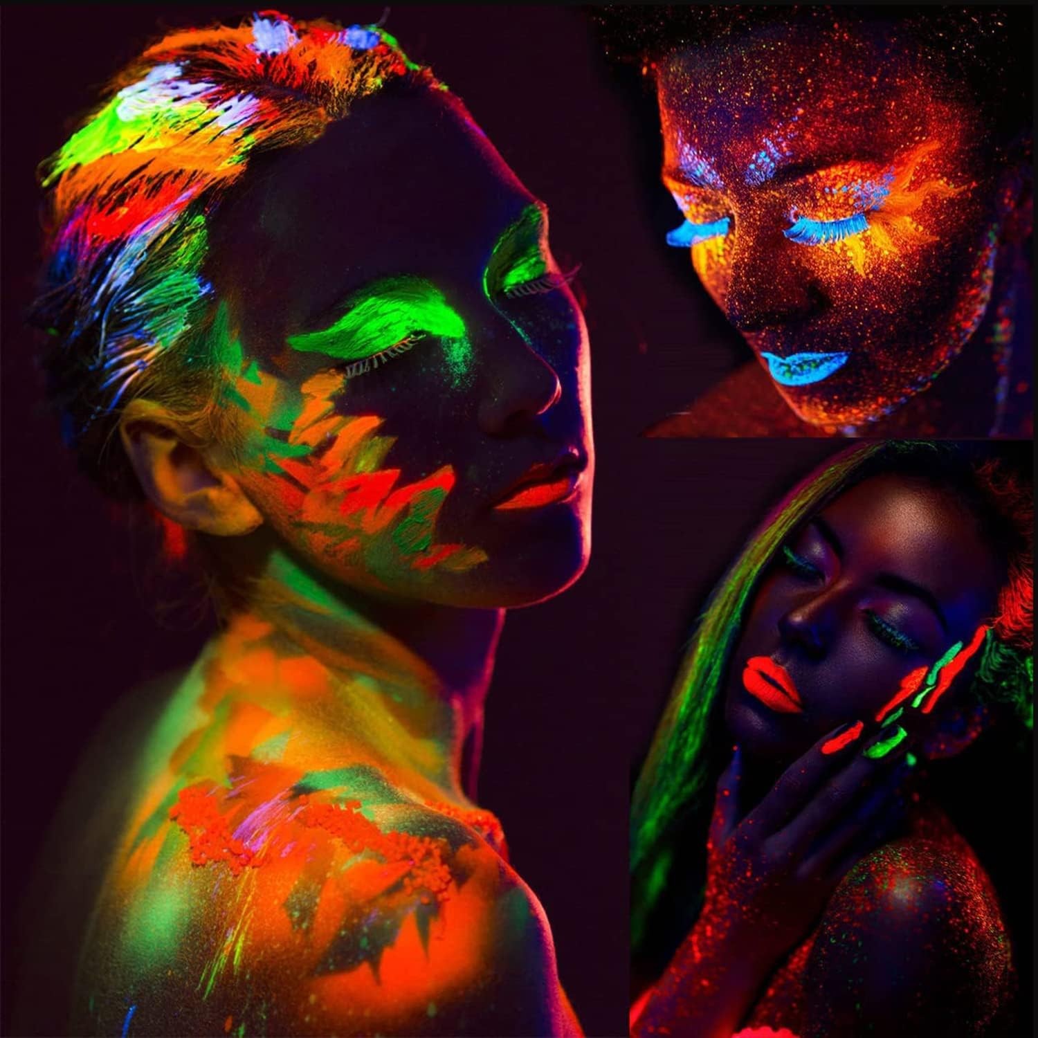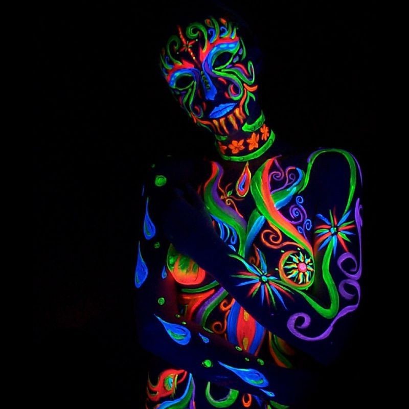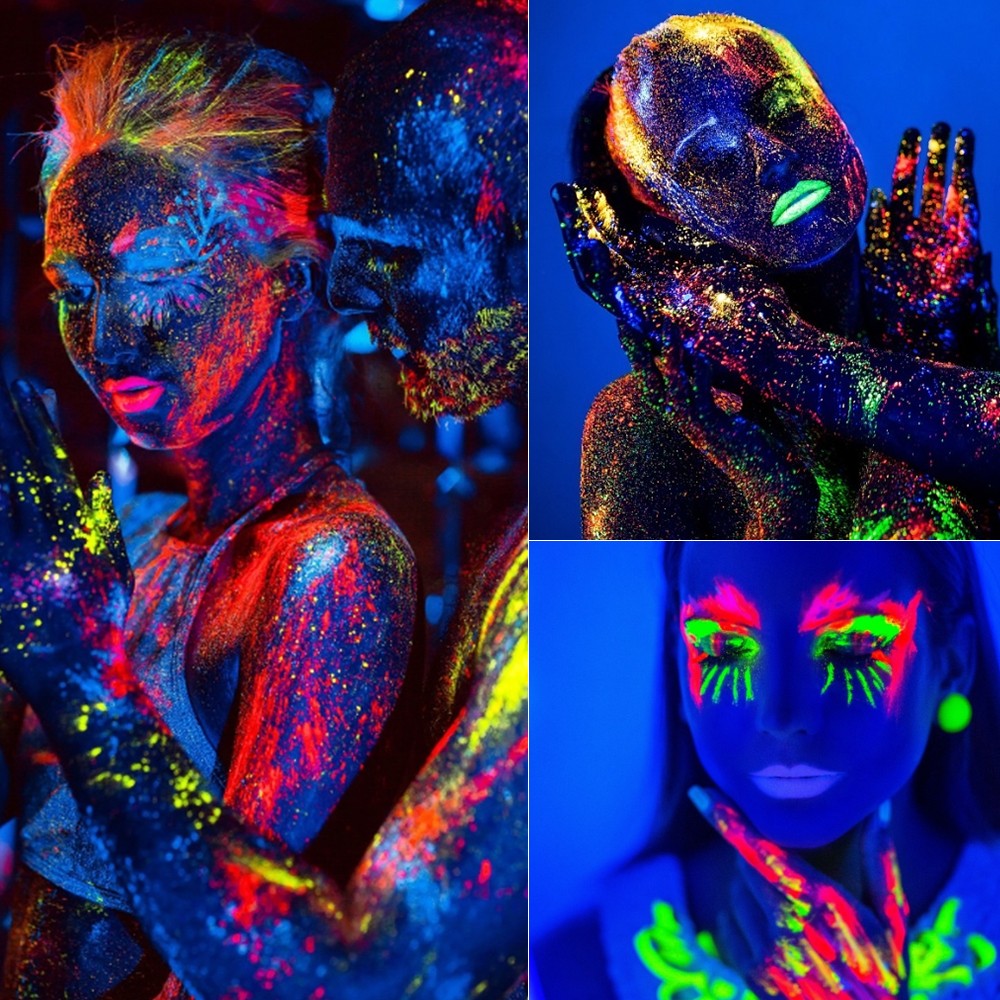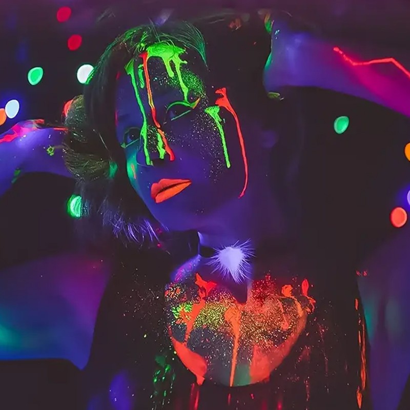 Utilizare: Agită înainte de folosire. Aplică pe pielea curată cu pensula, burețelul sau degetele, în strat subțire; pentru intensitate mai mare, aplică 2 straturi după uscarea primului. Pentru efect maxim, folosește o lampă UV/blacklight.
