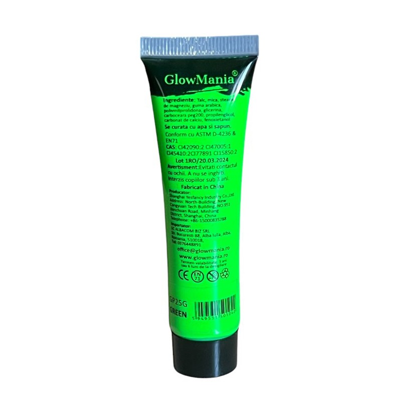 Vopsea UV neon verde GlowMania pentru body painting, glow sub UV, 25 ml