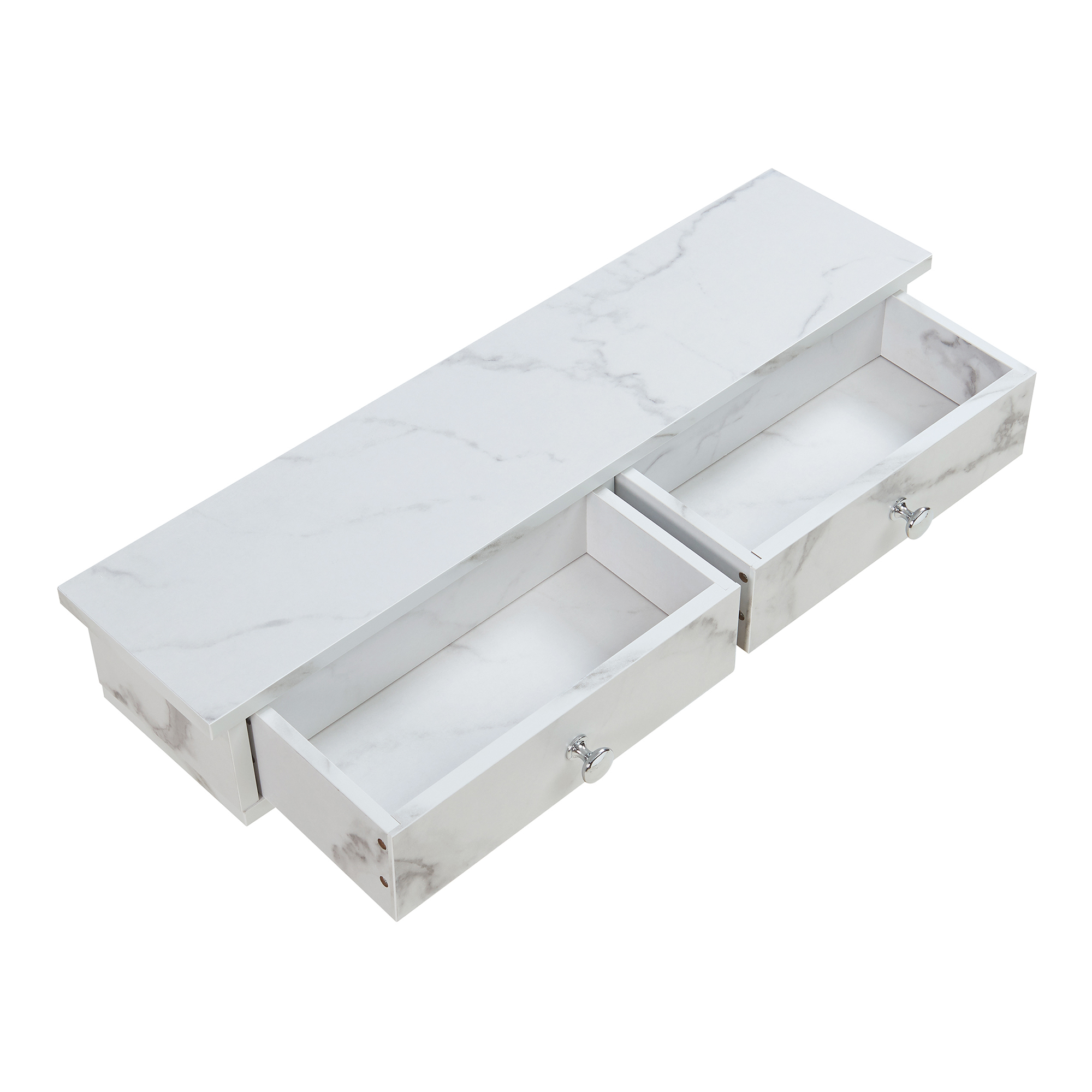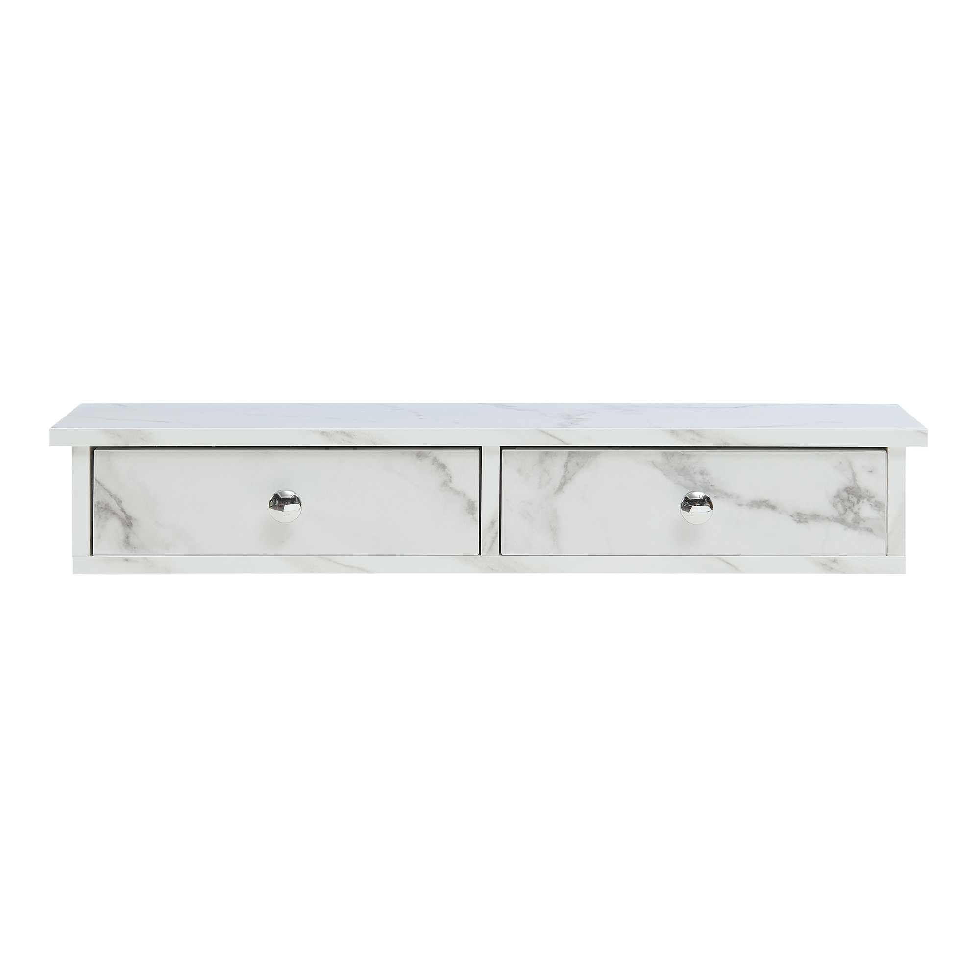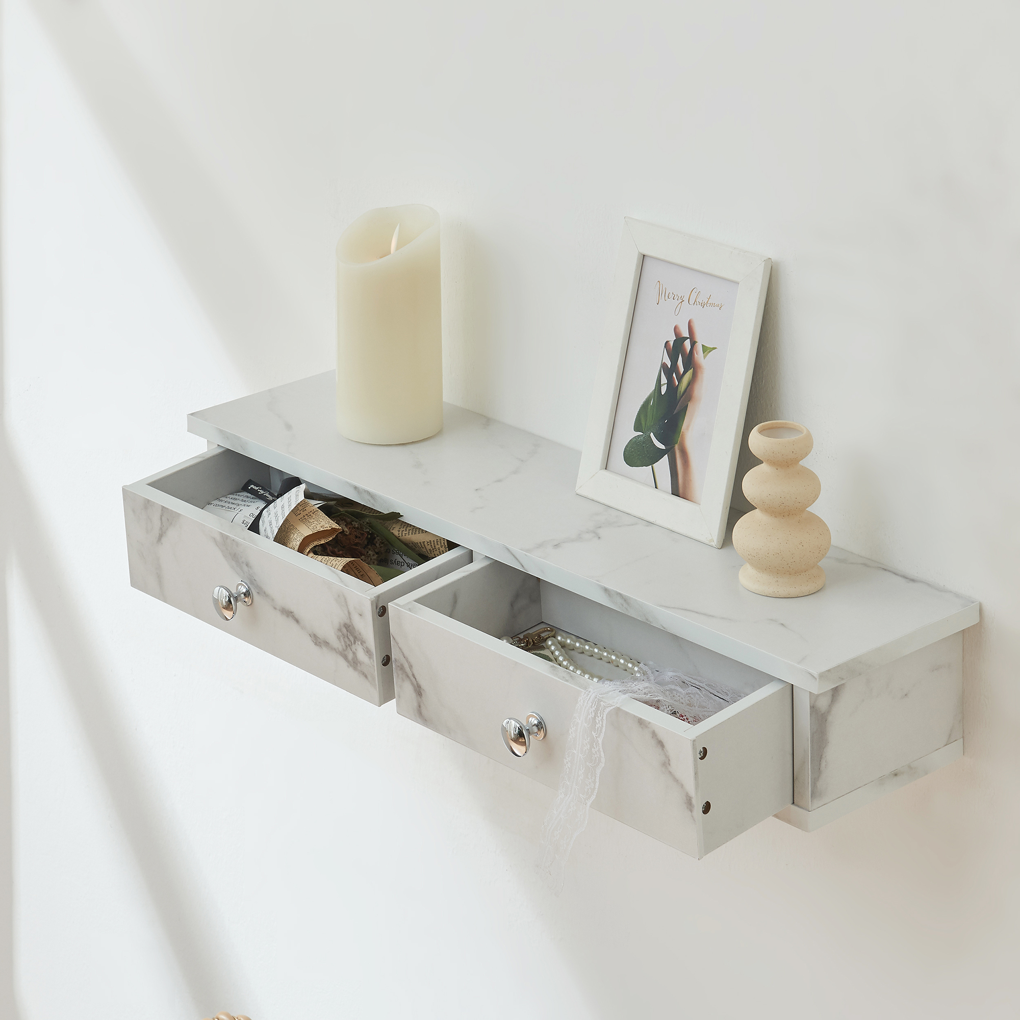 Dieses elegante Wandregal verfügt über zwei Schubladen, die ausreichend Platz schaffen, um Ihre Gegenstände ordentlich zu verstauen. Die obere Ablagefläche bietet eine praktische Möglichkeit, Ihre Deko, Erinnerungsstücke und weitere Objekte stilvoll zu präsentieren und zu organisieren.