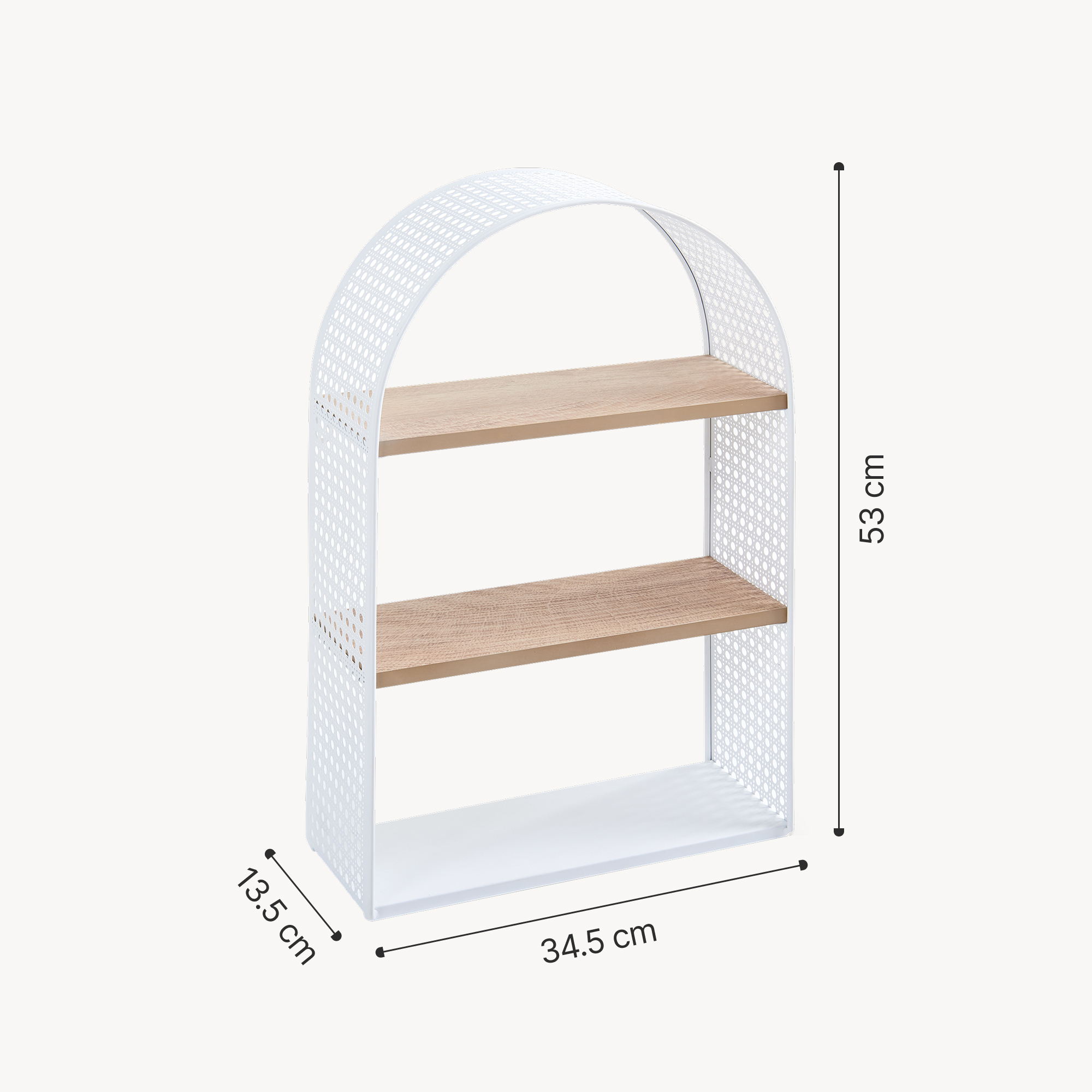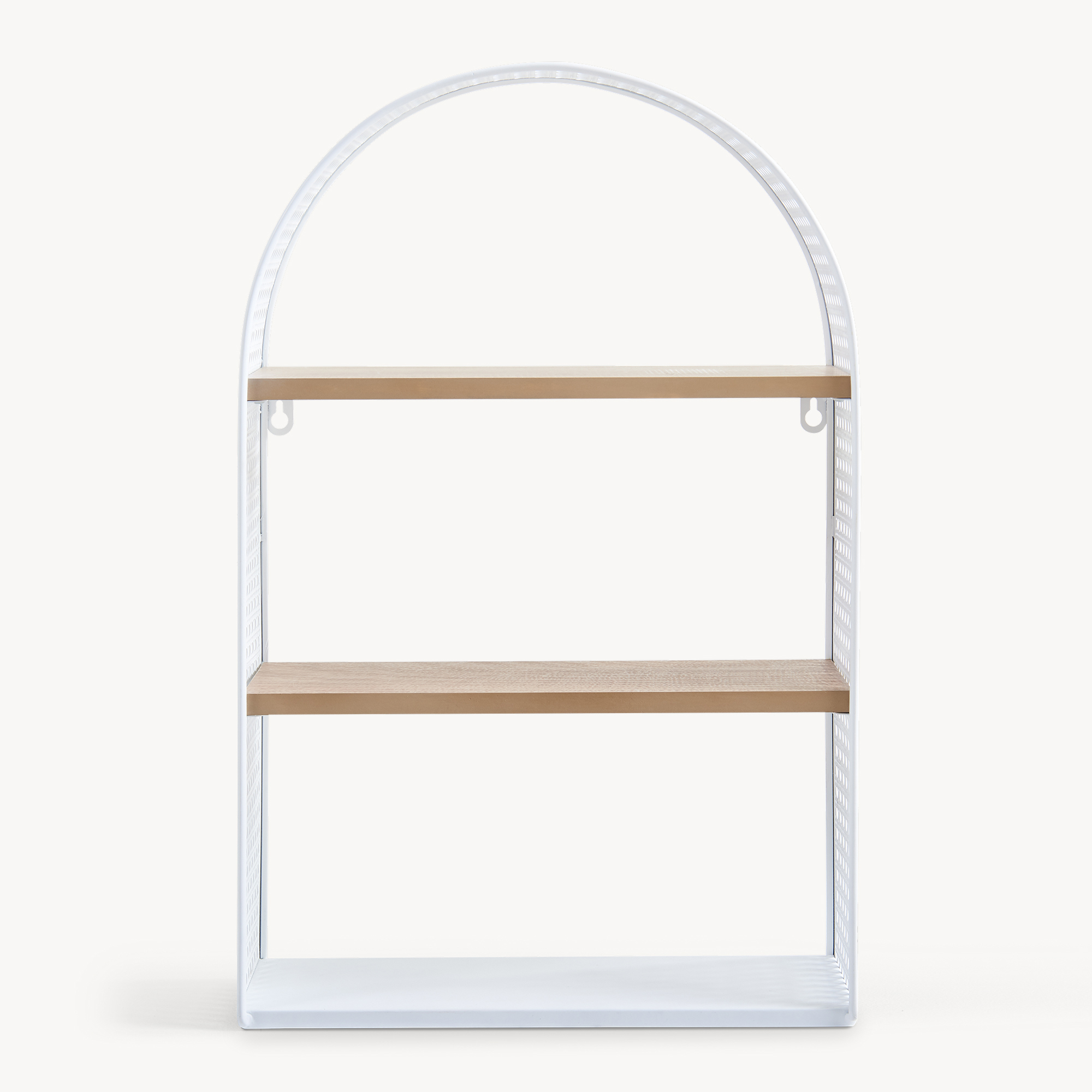 Das geschwungene Bogendesign und das Lochmuster in Rattanoptik verleihen dem Wandregal eine warme, wohnliche Note. Das ästhetische Erscheinungsbild fügt sich nahtlos in jede Einrichtung ein.