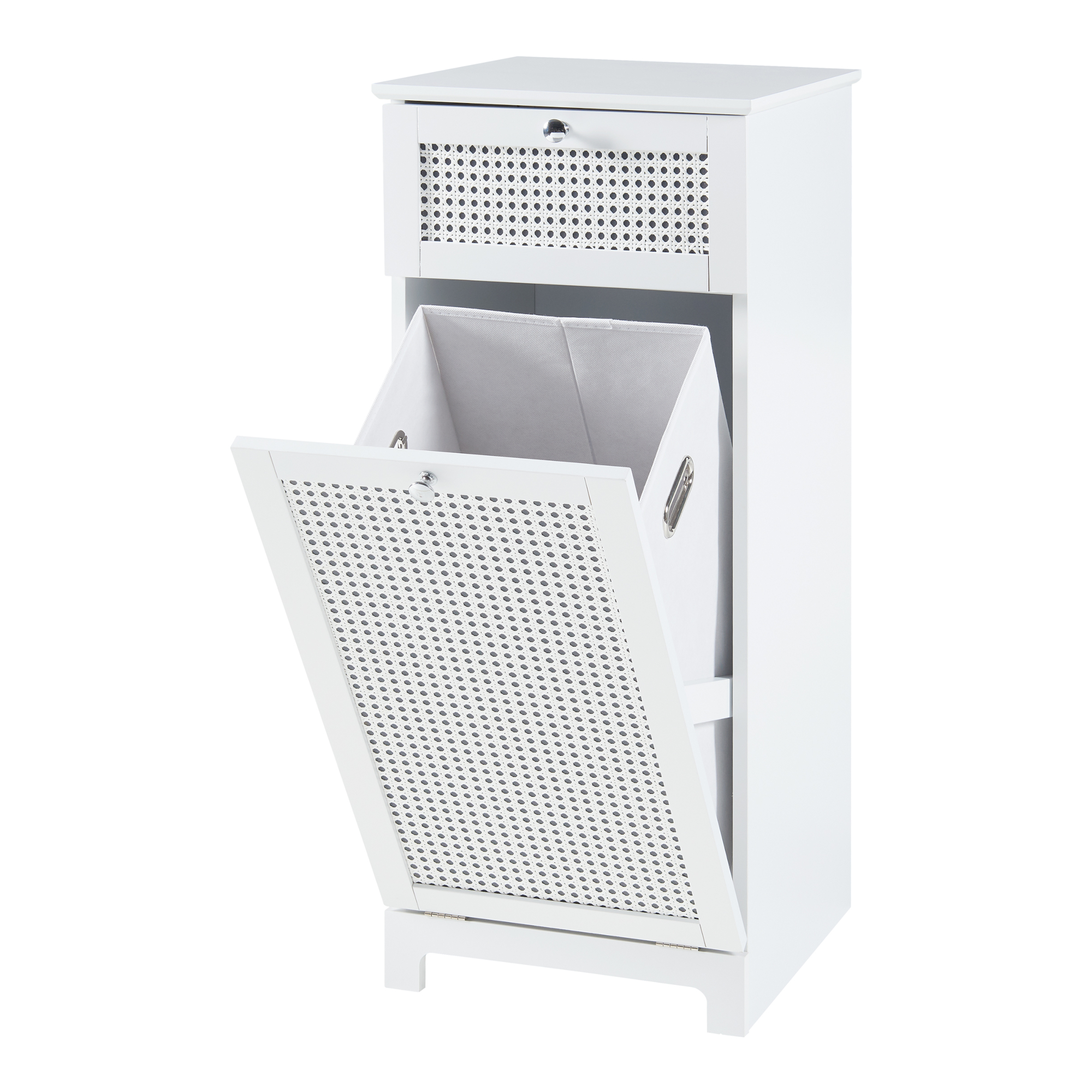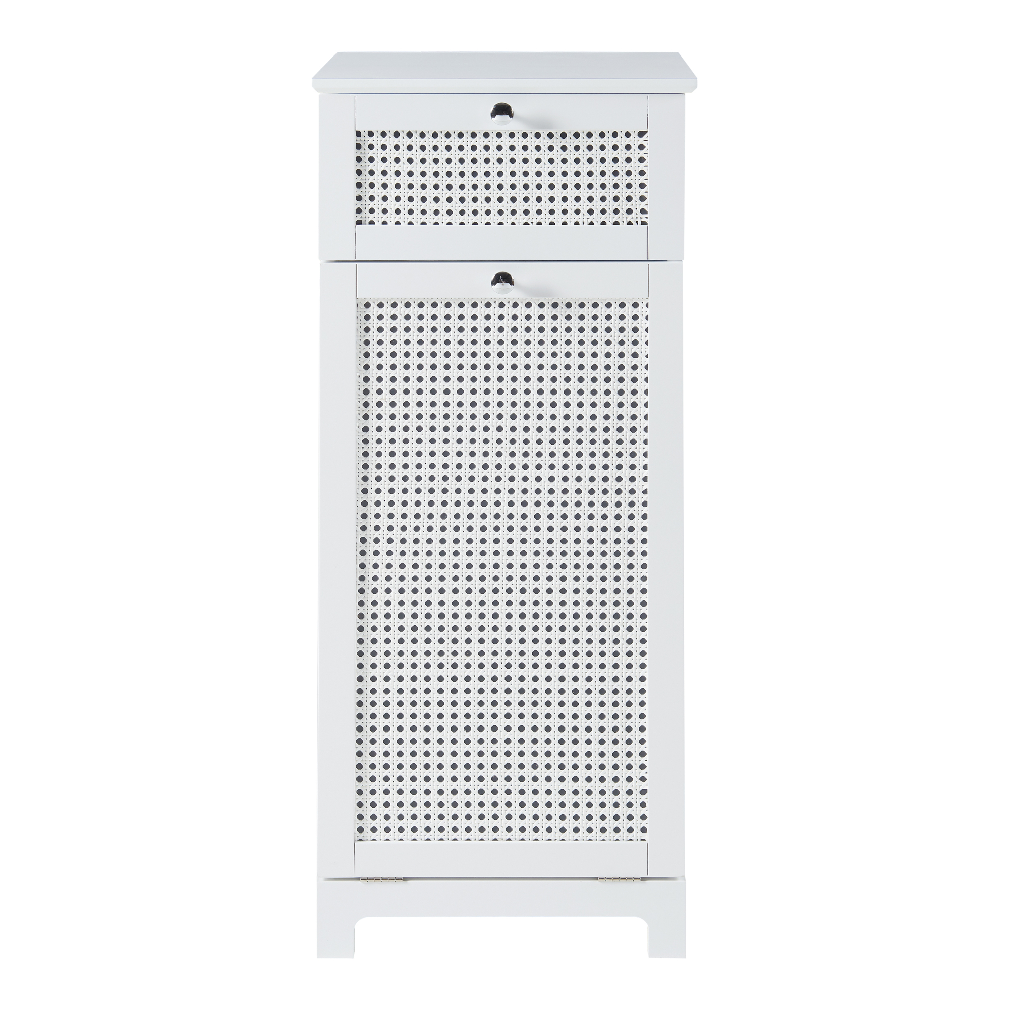 Die Tür des Schranks lässt sich mühelos öffnen und schließen und gewährt somit einen unkomplizierten Zugang zum Wäschebehälter. Die obere Schublade hingegen eignet sich optimal zur geordneten Aufbewahrung verschiedenster Gegenstände wie etwa Pflegeprodukte oder Reinigungsartikel.