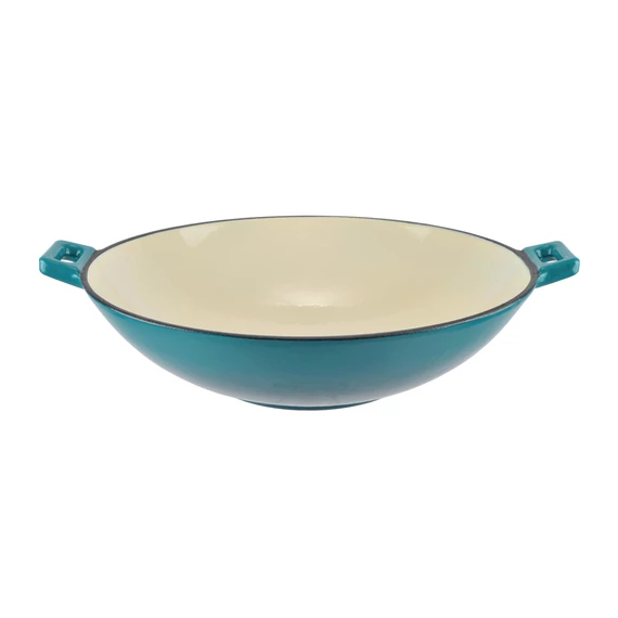 Wok din fontă emailată 37 cm, turcoaz, compatibil cu inducție și cuptor