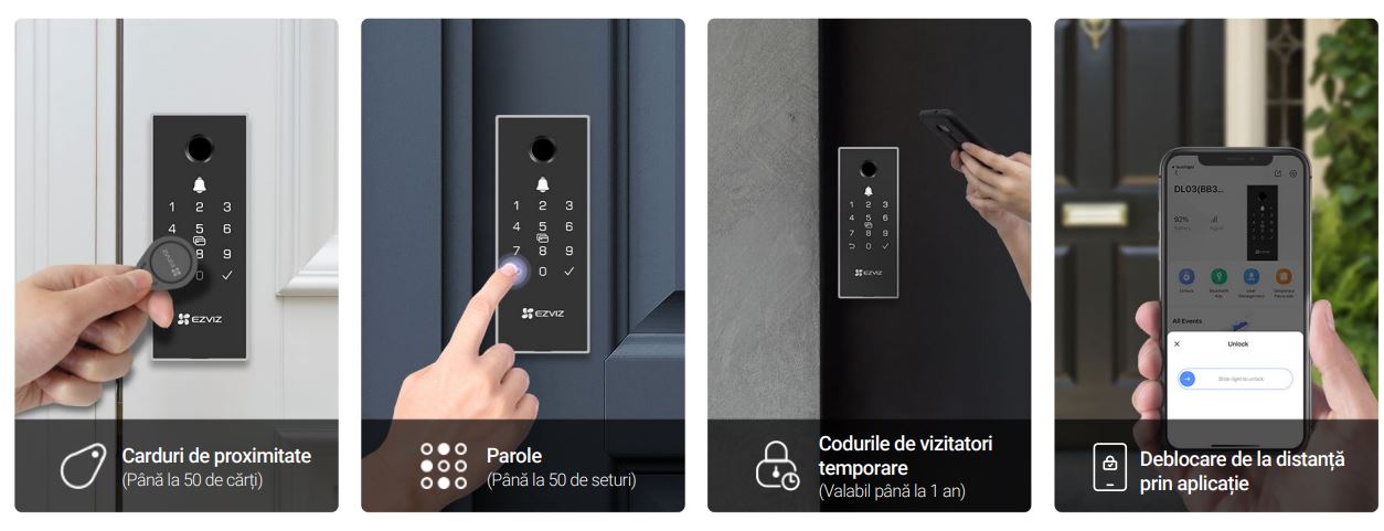 Imbunatatiti-va accesul in casa prin deblocare fara cheie si de la distanta, cu noul model DL03 Pro de la EZVIZ. Fara a necesita un hub de conectare, DL03 Pro se conecteaza direct la reteaua Wi-Fi de acasa pentru o automatizare fara probleme si poate functiona impreuna cu camerele EZVIZ pentru protectie vizibila suplimentara. Deblocati-va usa in functie de modul preferat folosind amprentele, introducand coduri de acces, utilizand un tag sau prin intermediul smartphone-ului, chiar si atunci cand sunteti departe de casa.