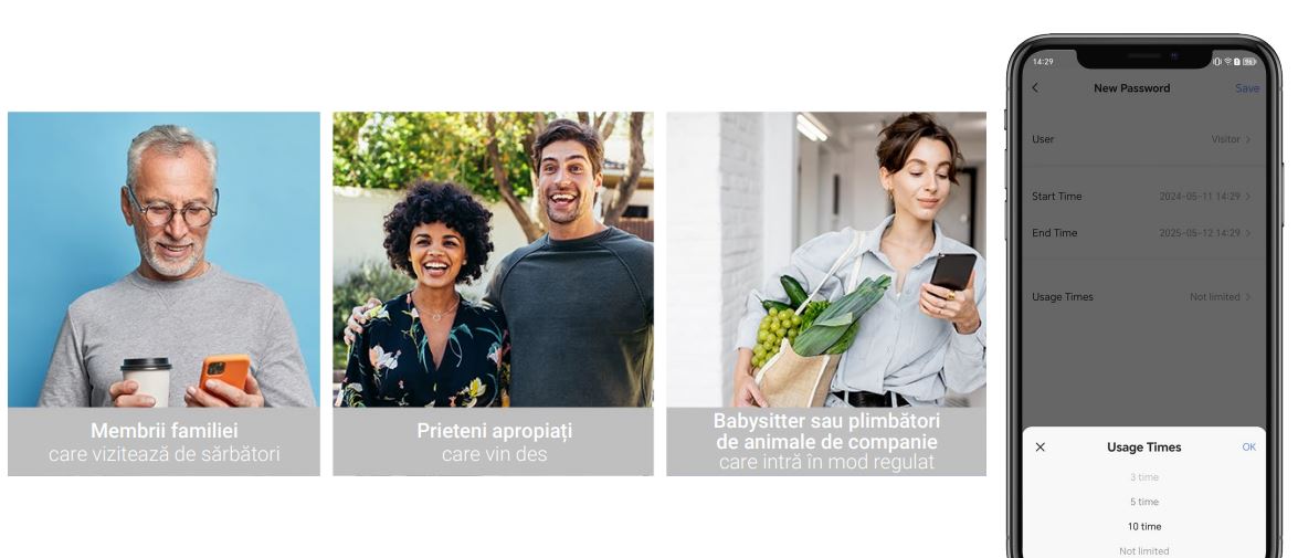 Puteti acorda sau revoca accesul cuiva cu doar cateva atingeri. Fie ca este vorba de un acces unic, fie ca este vorba de un acces recurent, puteti sa decideti prin intermediul aplicatiei Ezviz cui permiteti accesul in locuinta dvs.