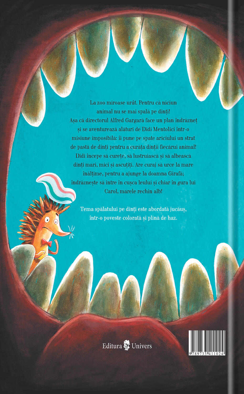 Cu un stil prietenos și ilustrații atractive, această carte pentru copii este potrivită pentru lectura de seară, activități educative sau pentru a deschide discuții despre obiceiuri sănătoase. Tema este prezentată într-un mod accesibil, astfel încât copiii să înțeleagă mai ușor de ce periajul dentar este important.